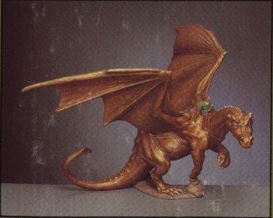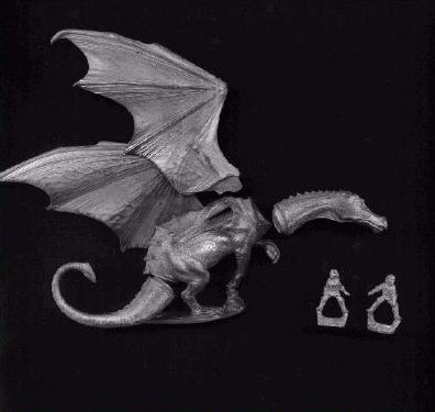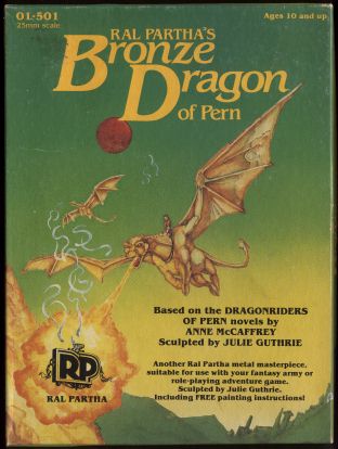 Ceci est une version miniature d'un Dragon Bronze de Pern édité par Ral Partha au début des années 80. Elle est sculptée par Julie Guthrie qui a beaucoup travaillé pour Ral Partha à cette époque. C'est une miniature en plomb qui, une fois assemblée, mesure environ 13cm de haut pour 15cm de long. Elle comprend 5 morceaux pour le dragon et deux cavaliers.